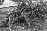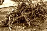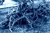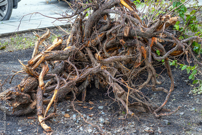 The roots of a tree felled by a storm on a summer day