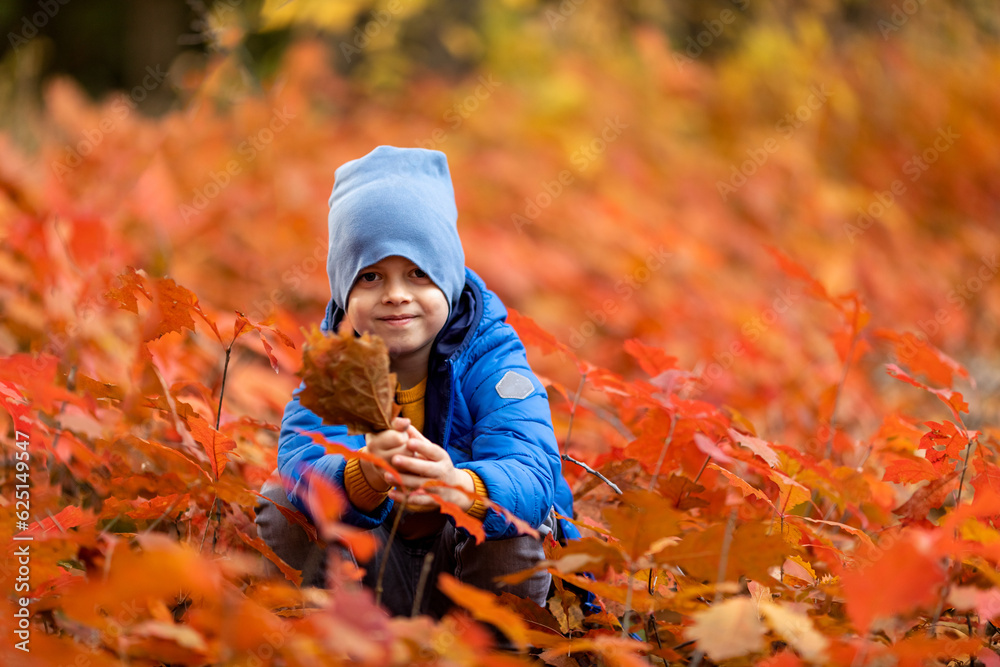 Close up autumn portrait of a happy cute little boy in autumn park. Preschooler child in fall forest. Bokeh. Selective focus