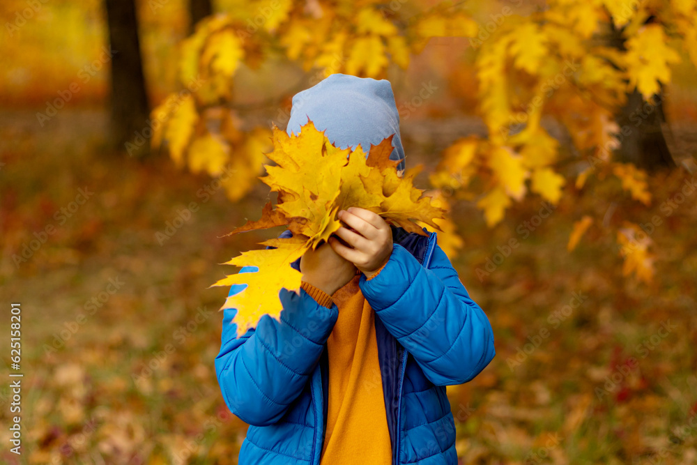 Child covers his eyes with a yellow maple leaf in the autumn park. Happy kid, little boy, playing in beautiful autumn park on warm fall day. Kids play with golden maple leaves close up. Autumn leaves