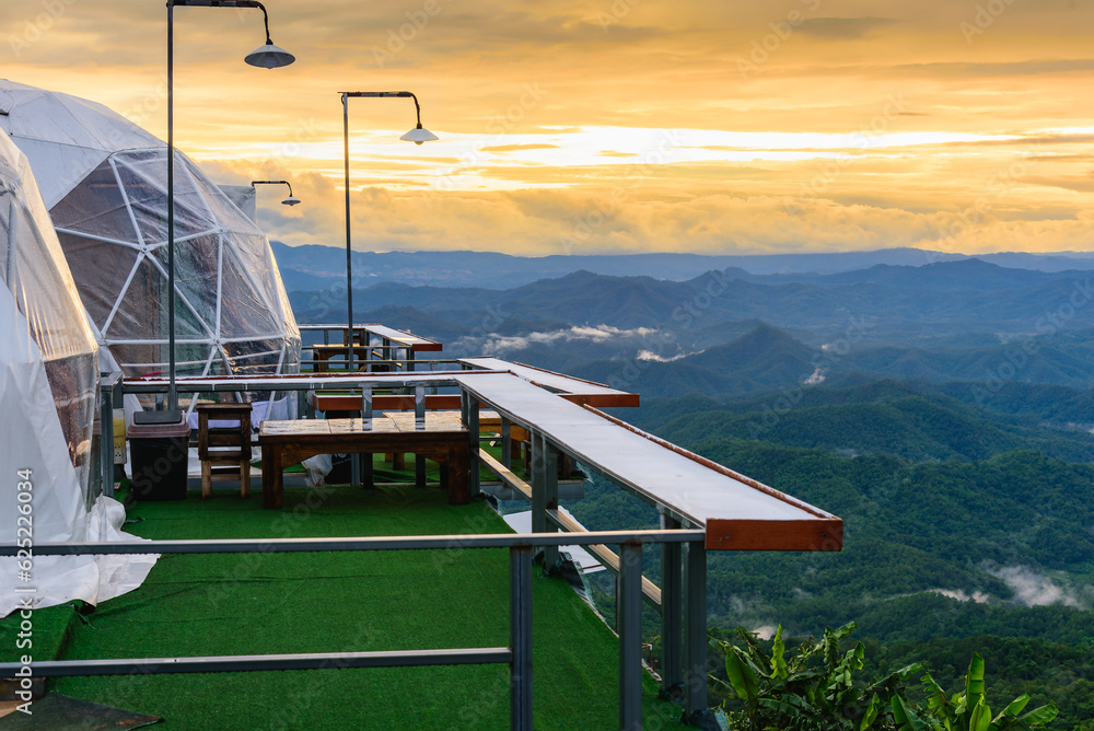 Glamping dome tent for outdoor camping with mountains view at sunset.