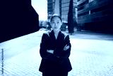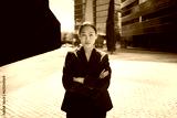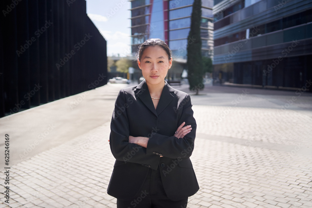 Portrait of serious young Asian business woman looking at camera arms crossed. Confident Chinese female formal work suit poses outside office center. Copy space and background staff earnest people.