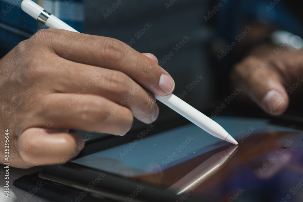 Latin graphic designer working in his office on an illustration tablet, he wears a blue checkered shirt and glasses.