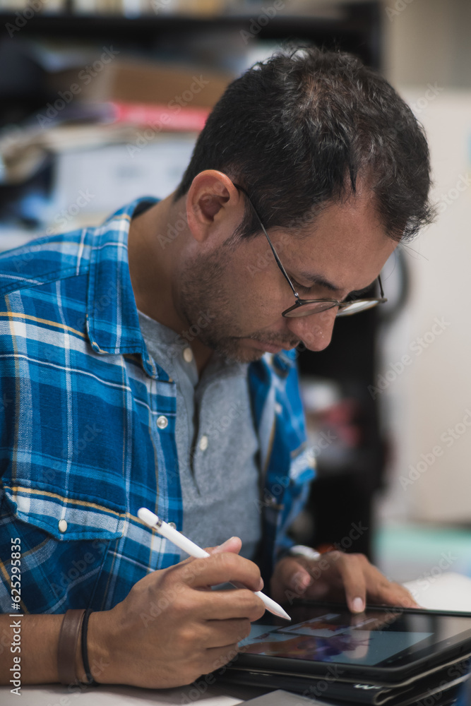 Latin graphic designer working in his office on an illustration tablet, he wears a blue checkered shirt and glasses.