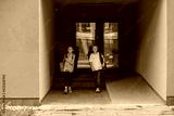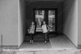 Two children walk out of school door. Students have school backpacks behind them. Back to school