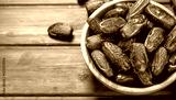 Dates or dattes palm fruit in wooden bowl is snack healthy.