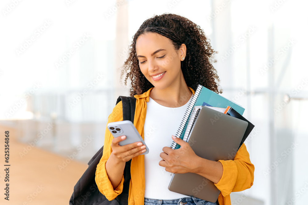 Positive pretty, curly haired mixed race female student, with a backpack, books and notebooks in her hand, stand near the university campus, holds a smartphone, messaging in social media, smiles