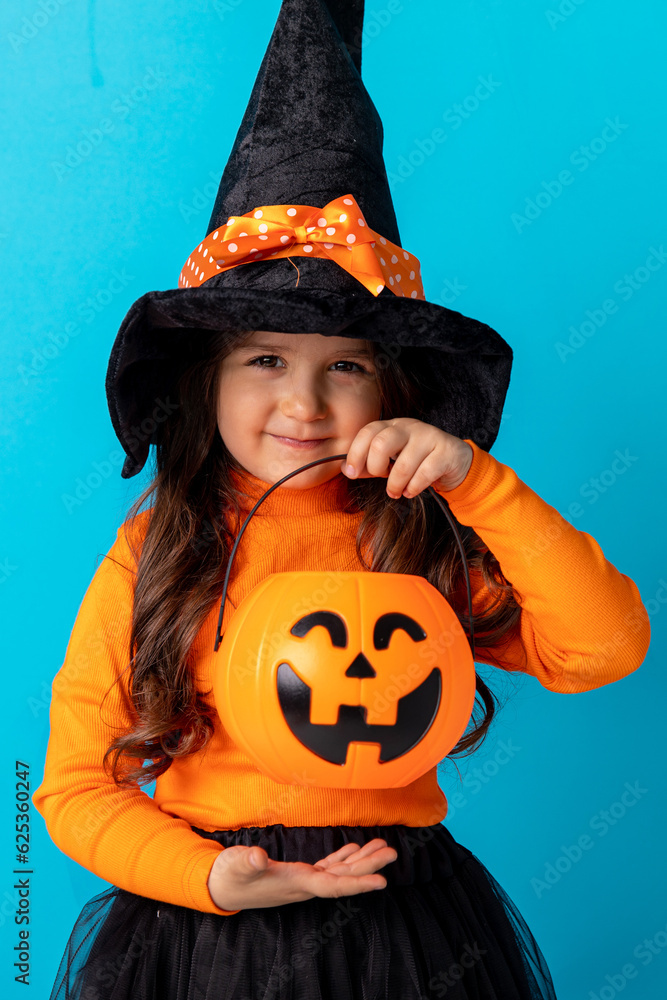 Halloween Party girl. Funny child girl in witch costume celebrates Halloween with pumpkin pot on bright blue background