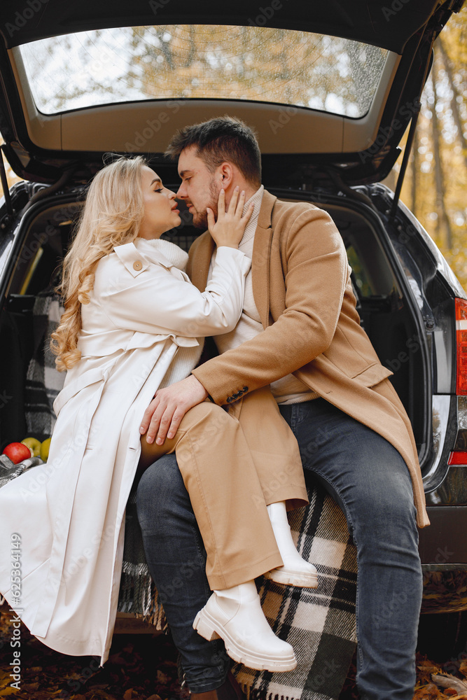 Lovely couple sitting inside car trunk in autumn forest