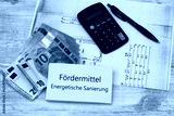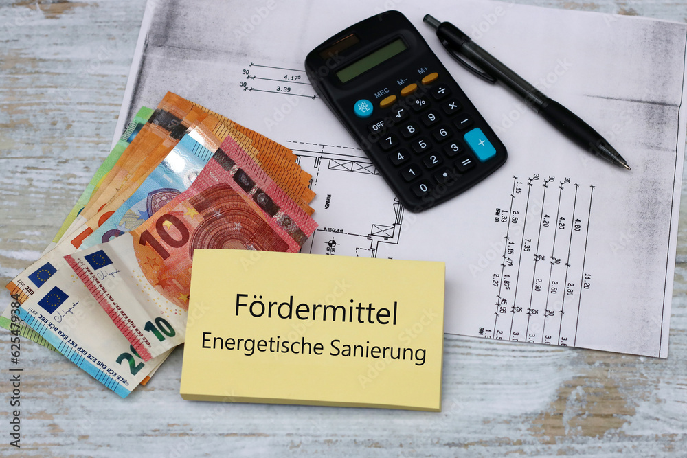 Fördermittel energetische Sanierung: Taschenrechner, Geldscheine und der Text Fördermittel energetische Sanierung auf einem Notizblock.