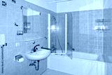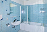 Unrenovated bathroom from the 1970s with the original blue tiles, seventies style. Outdated, neglected and grimy bath in an apartment for rent.