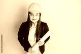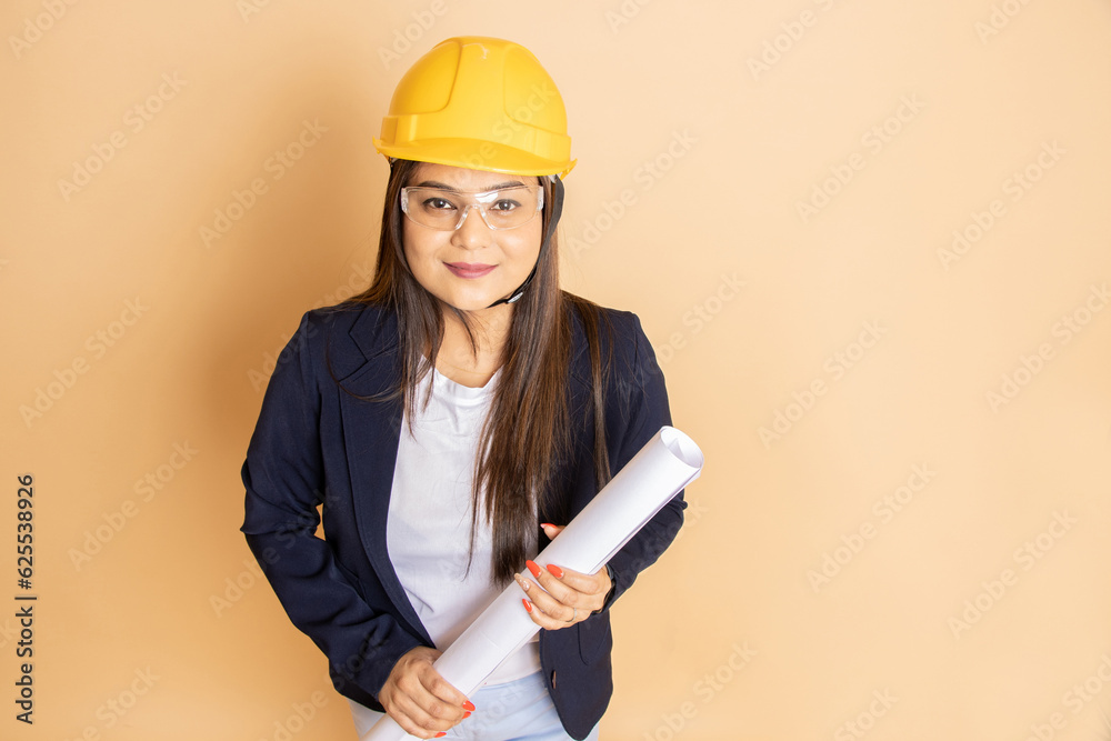 Young indian female engineer or architect wearing black formal suit and yellow hard hat or helmet holding blueprint isolated over beige background. Construction concept. Copy space.
