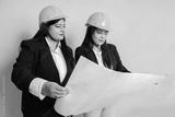 Young indian female engineers or architects wearing black formal suit and yellow hard hat or helmet holding blueprint discussing project work isolated over beige background. Construction concept.