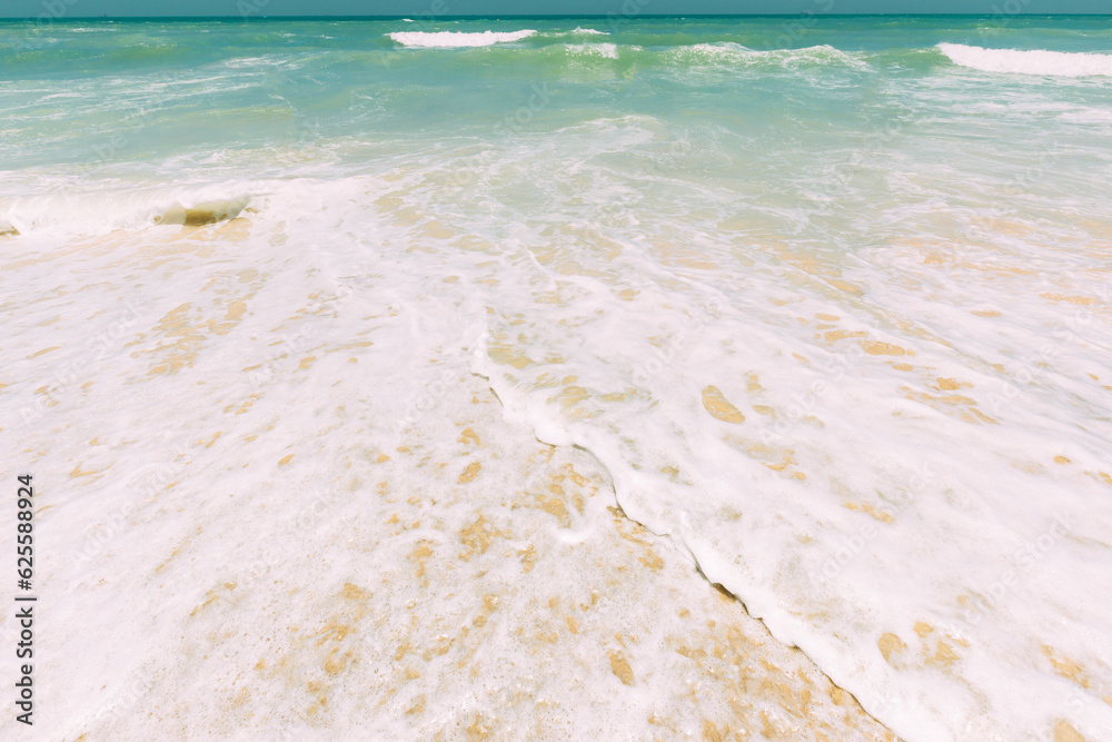 Ocean water foam splashes washing sandy beach. Amazing landscape scenery. Crashing waves of sandy coastline. Sea ocean water surface with small waves. Beautiful nature background with copy space.
