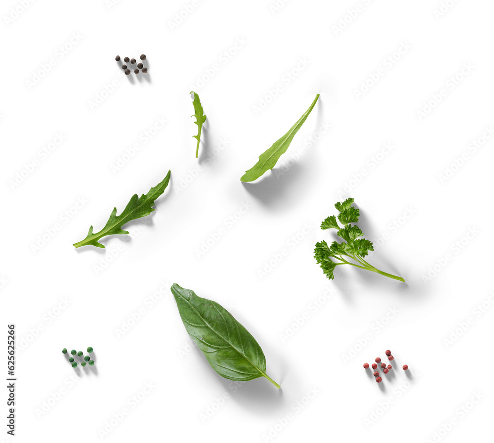 Collection of herbs and pepper spices from above with a semitransparent shadow
