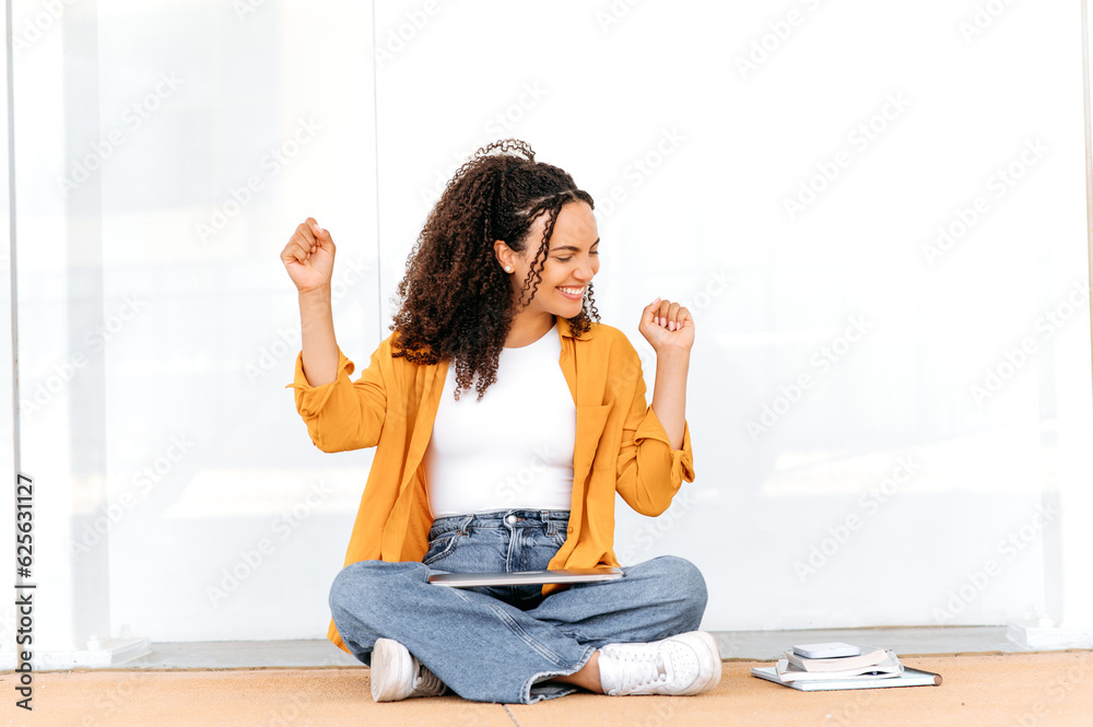 Success, win. Joyful curly haired brazilian or hispanic female student, sits on the floor near the university campus, finished studying online, rejoicing in luck, gesturing with both hands, smiling
