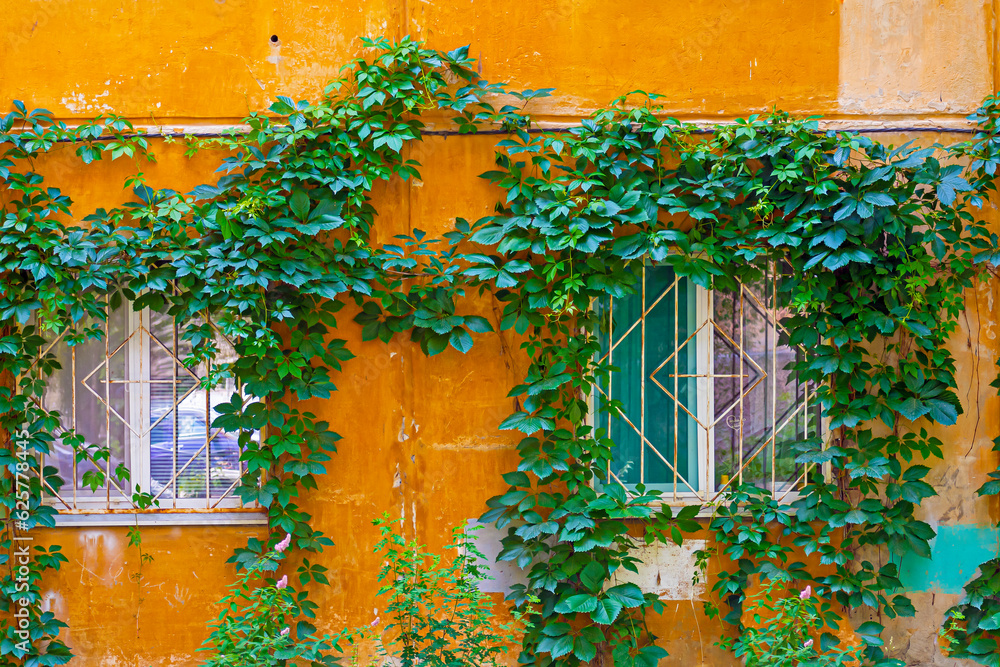 Fragment of the facade of an old house decorated with ivy on a summer day