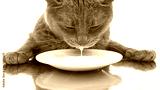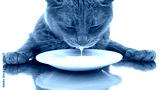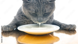 gray cat drinks fresh milk from a white plate. homemade breakfast concept with favorite animal