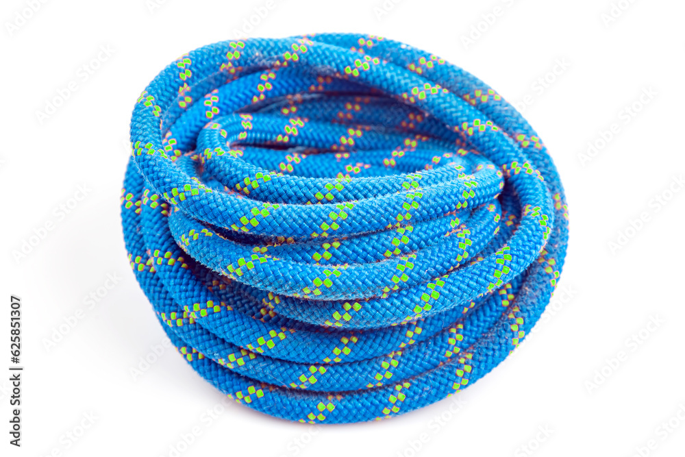 durable colored rope for climbing equipment on a white background. knot of braided cable. item for tourism and travel