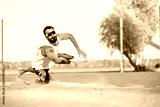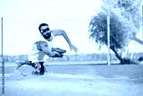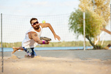 Sportive young man playing beach, paddle tennis, hitting ball with racket and falling down. Outdoor training on warm summer day. Concept of sport, leisure time, active lifestyle, hobby, game, ad