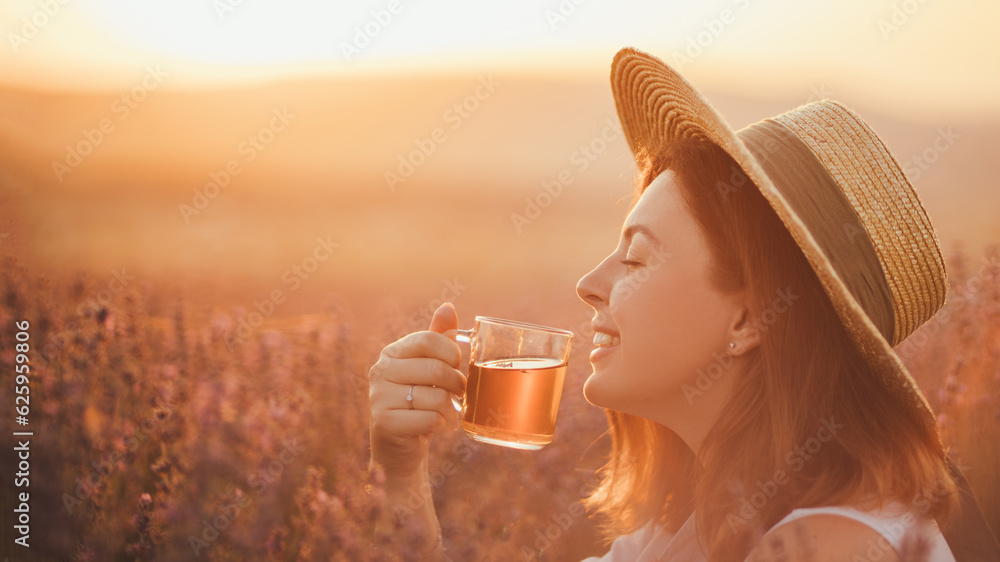 Young happy woman drinking herbal tea, sitting in a beautiful lavender field at sunset.