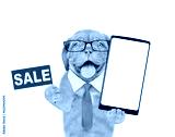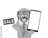 Smart Mastiff puppy wearing necktie holds big smartphone with white blank screen in it paw and shows signboard with labeled "sale". isolated on white background