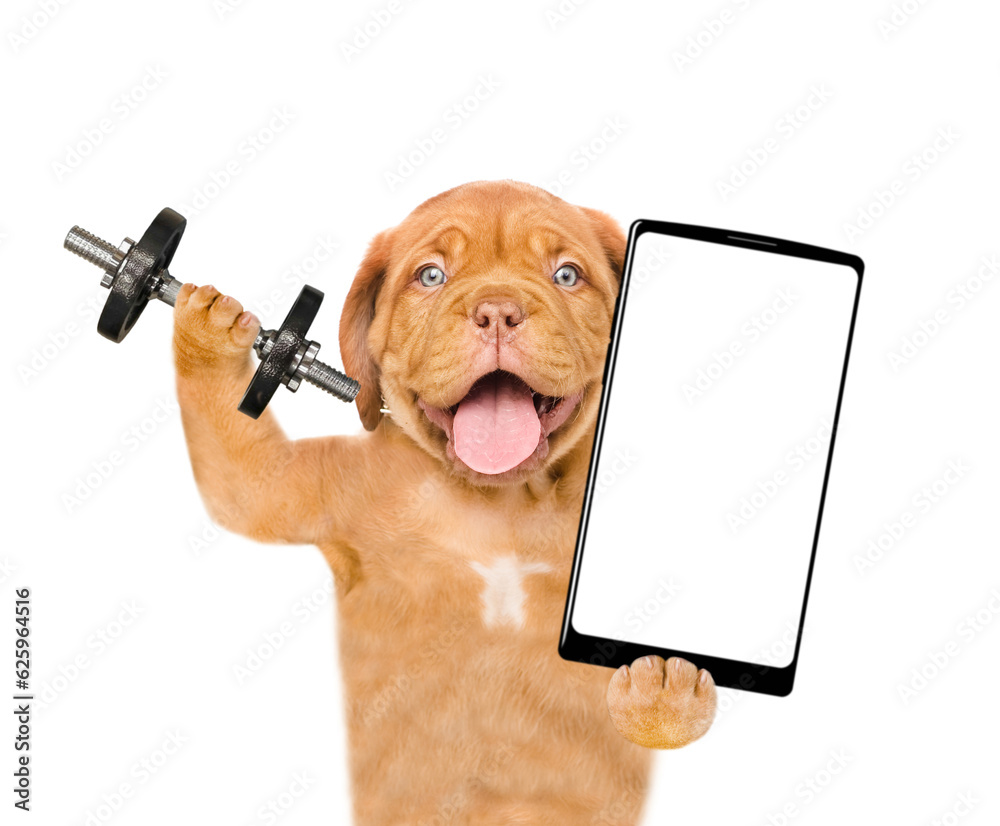 Happy Mastiff puppy lifts dumbbells and holds big smartphone with empty screen in it paw . isolated on white background