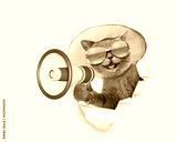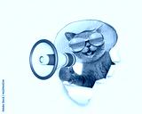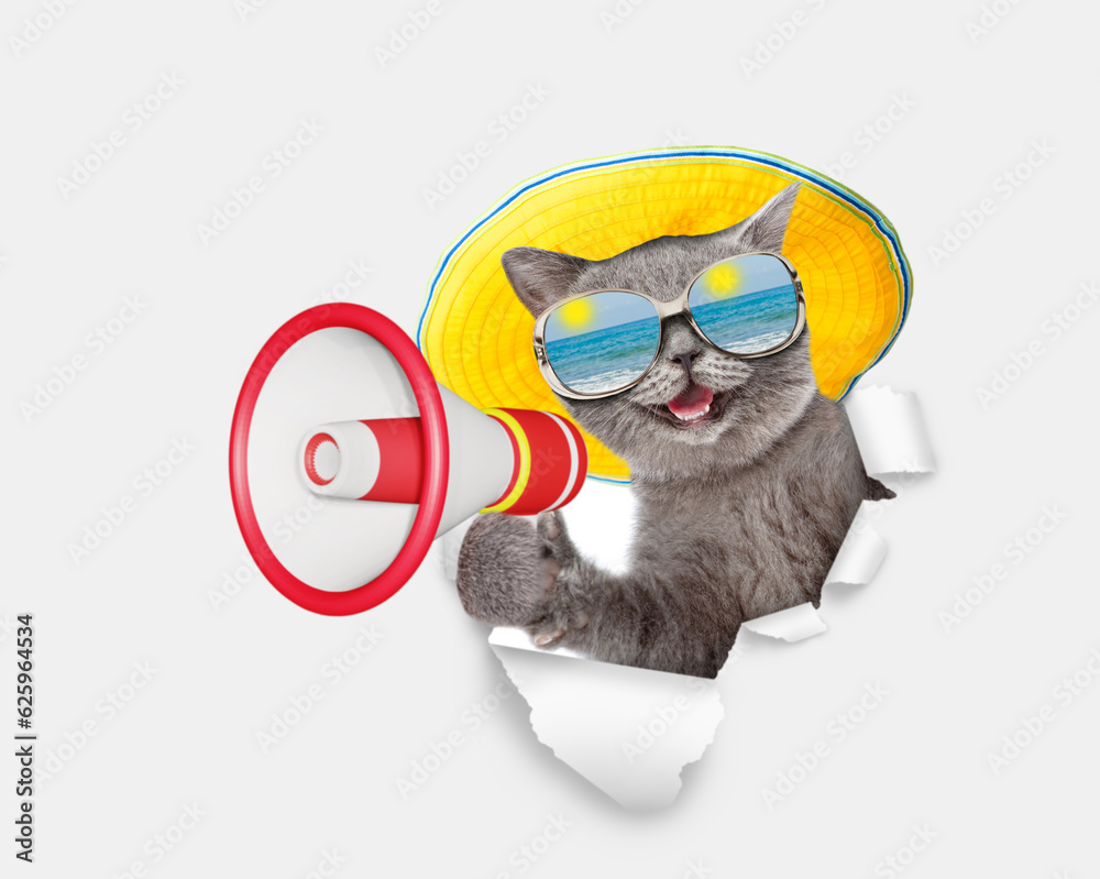 Happy cat wearing mirrored sunglasses and summer hat screaming into a megaphone and looking through the hole in white paper