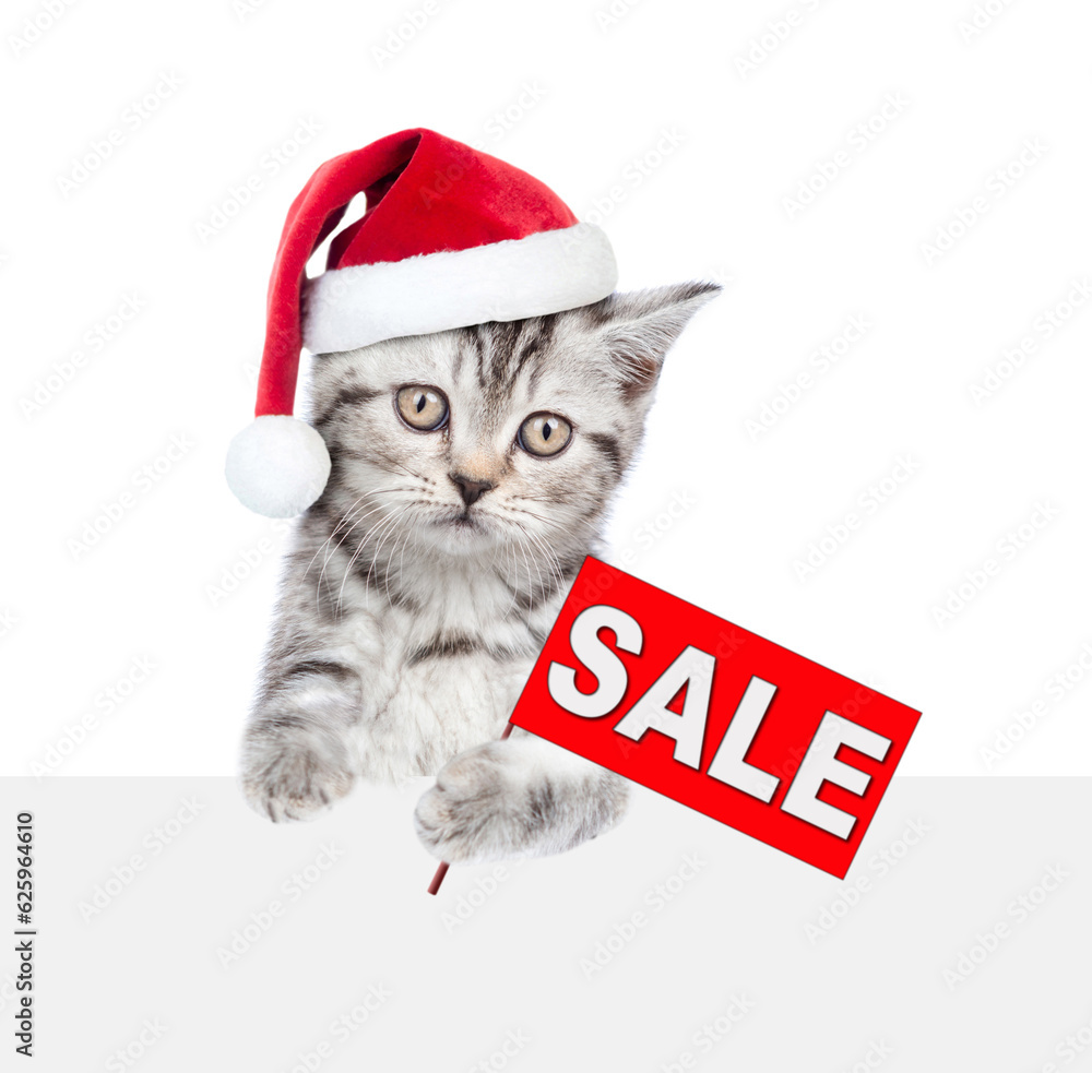 Cute tiny kitten wearing red christmas hat shows signboard with labeled "sale"above empty white banner. isolated on white background
