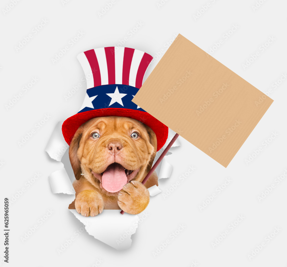Happy Mastiff puppy wearing like Uncle Sam looking through a hole in paper and shows empty placard. isolated on white background