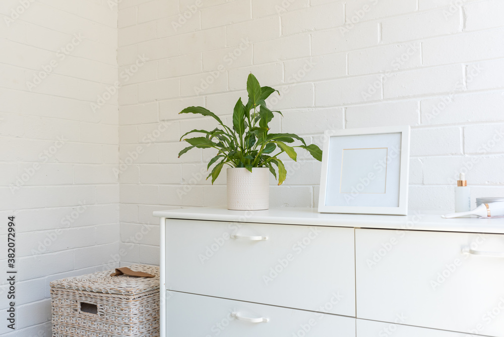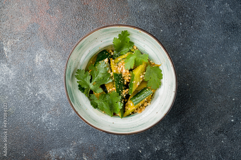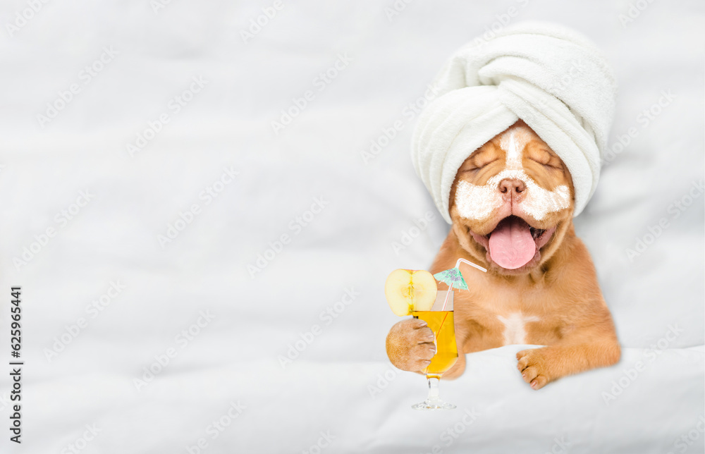 Funny Mastiff puppy with towel on it head and with cream on his face holds apple cocktail and relaxing on the bed at beauty salon. Top down view. Empty space for text