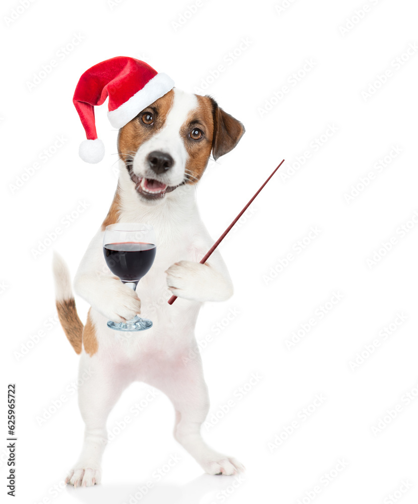 Jack russell terrier puppy wearing santa hat holds glass of red wine and points away on empty space. isolated on white background