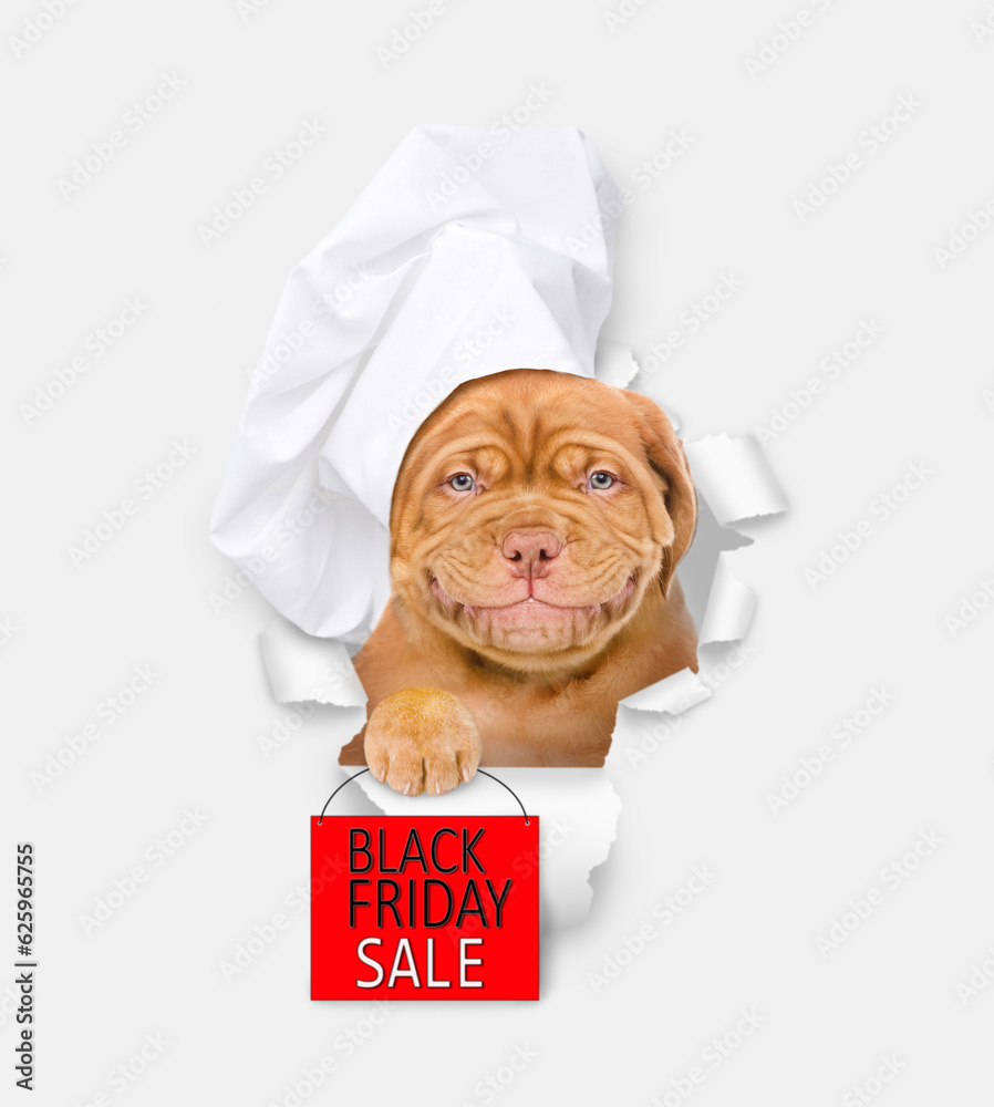 Smiling Mastiff puppy wearing chef's hat looking through a hole in white paper and holding signboard with labeled "black friday sale"