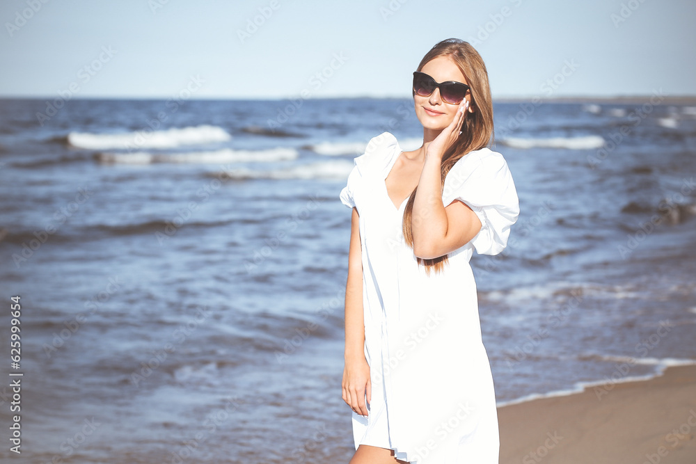 Happy smiling blonde woman is posing on the ocean beach with sunglasses