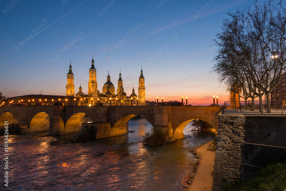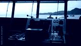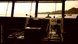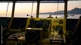 Main console of navigational bridge of modern ultra large container vessel with different data screens and navigational wheel during sunset
