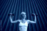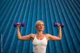 Adult female woman with dumbbells outdoors doing shoulder bodybuilding workout