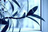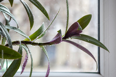 Tradescantia spathacea or a plant called boat lily in water drops on a window