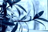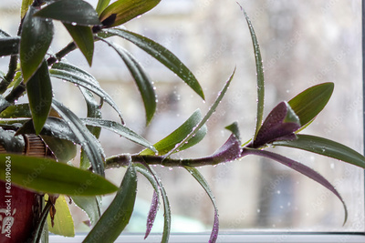 Tradescantia spathacea or a plant called boat lily in water drops on a window