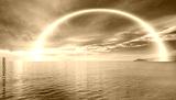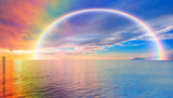Beautiful landscape with turquoise sea with double sided rainbow at sunset