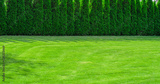 Perfekcyjnie skoszony trawnik otoczony żywopłotem z żywotnika zachodniego