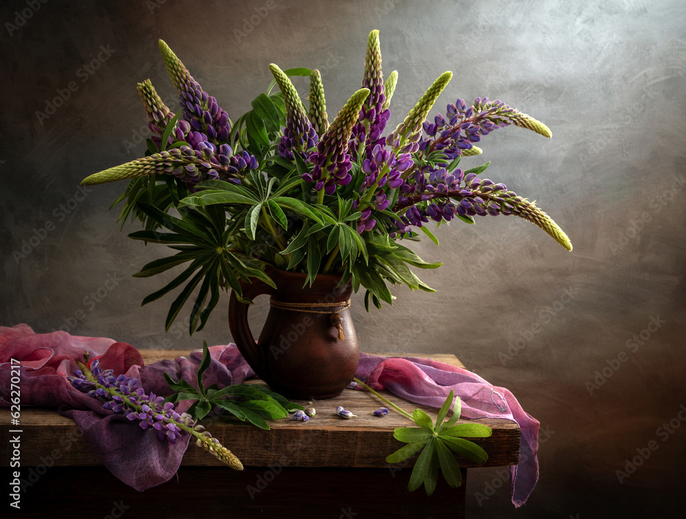 Still life with a bouquet of lupins on a wooden table against a dark background