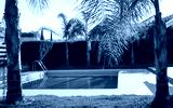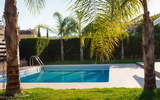 Small swimming pool with clean, blue water in the yard of a private house