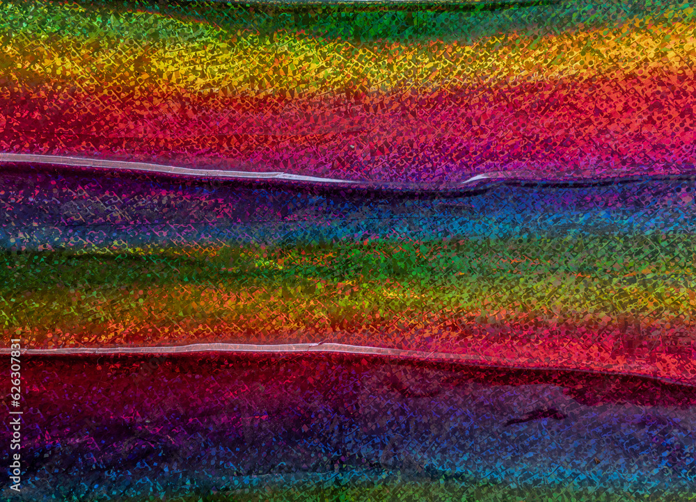 macro photo of rainbow holographic foil, colorful hologram surface, glitter grid pattern background.