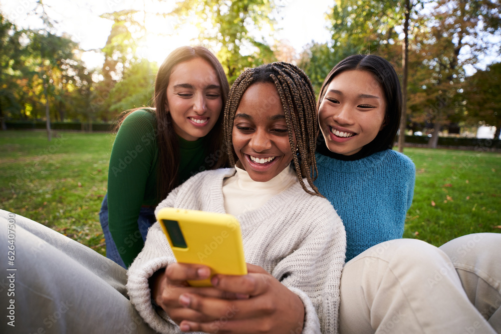 Three young multiracial women using smiling cell phone in park. Three teenage girls amusingly gossiping on a smartphone app. Millennial people connected through online platforms and social networks.