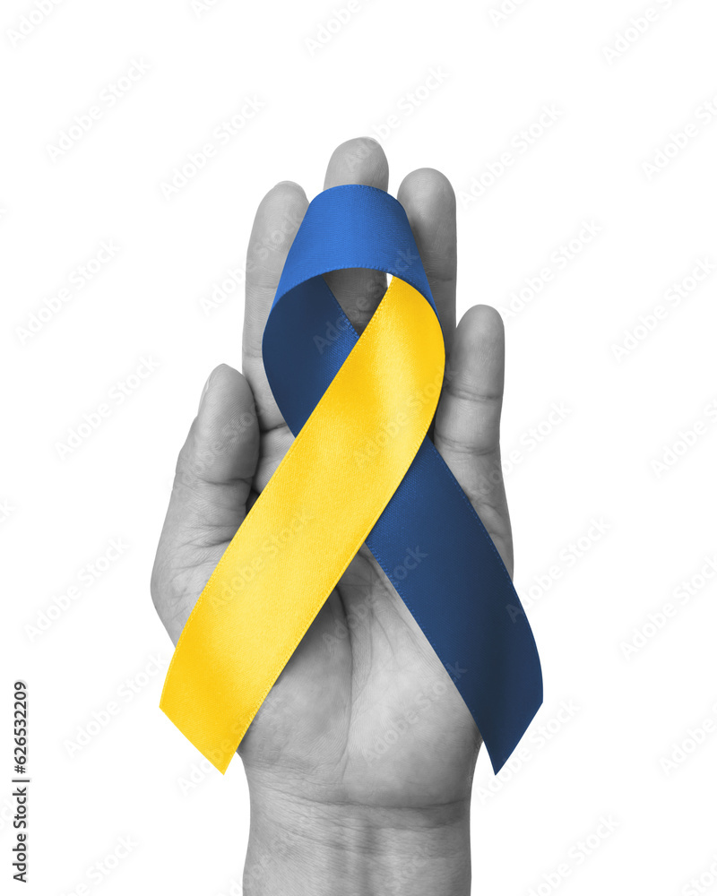 Blue yellow flag color of Ukraine UA, ribbon symbol of independence freedom, liberation, and unity and awareness for Down Syndrome, Thoracic Outlet Syndrome (TOS), bow isolated with clipping path