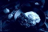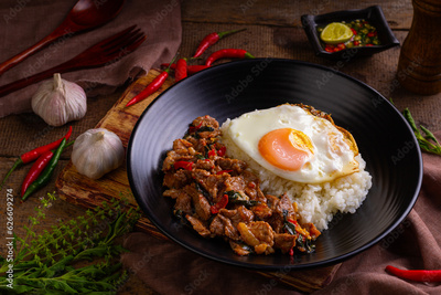 Stir fried sliced Beef with Holy Basil and Cooked Rice topped with fried egg in black plate.Thai spicy food(Pad Kra pao)