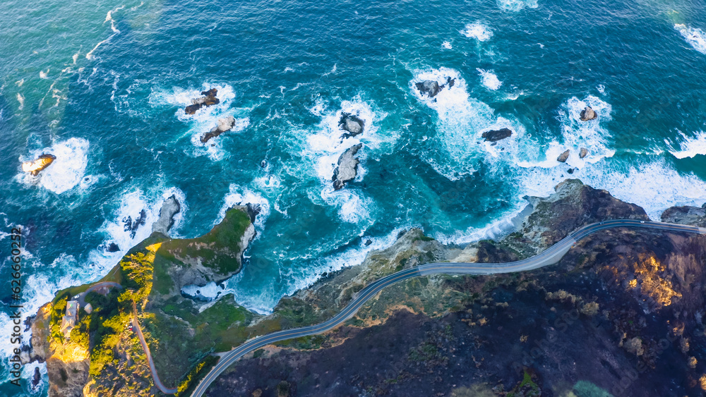 Spectacular drone photo, top view of seascape ocean wave crashing rocky cliff. Beauty of the sea. Beaches where land and sea meet seascape.