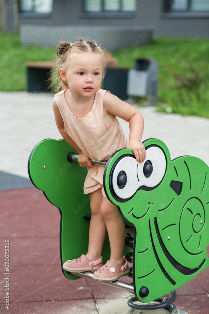 Little toddler girl having fun at playground. Baby development. Rocking frog with spring for kids.