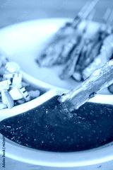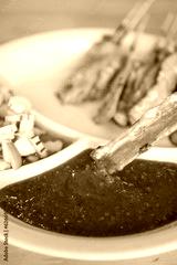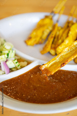 Thai pork satay with peanut sauce and cucumber with shallot sweet sour sauce on wooden table, Local Thai food