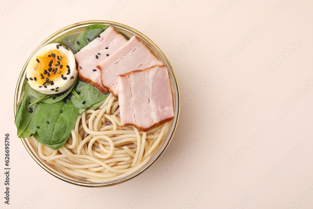 Delicious ramen with meat on beige background, top view and space for text. Noodle soup