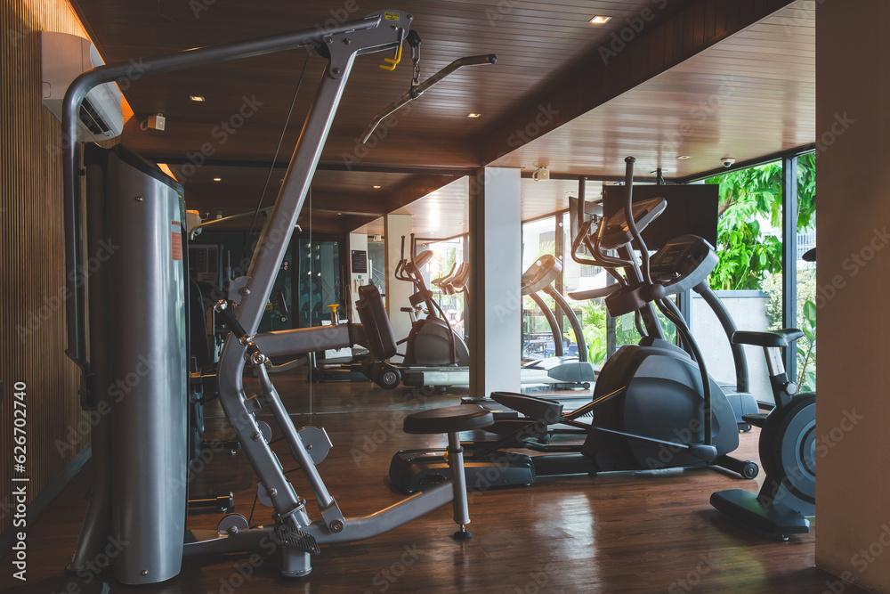 Still life shot of fitness equipment in modern of gym interior. Sport, fitness and healthy lifestyle concept.
